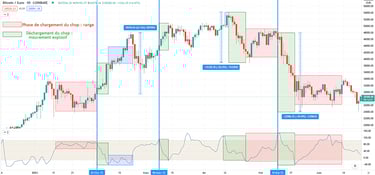 Turning to the blue zone, we see that the price stabilizes very quickly before continuing its trend while the CHOP consolidates in its lower limit.