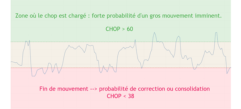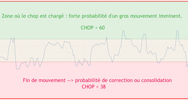 The Choppiness Index (CHOP) is also known as the agitation or turbulence indicator. It can be used to determine whether the market is in a consolidation or a trend phase, but above all to know precisely when the strong trend is about to start.